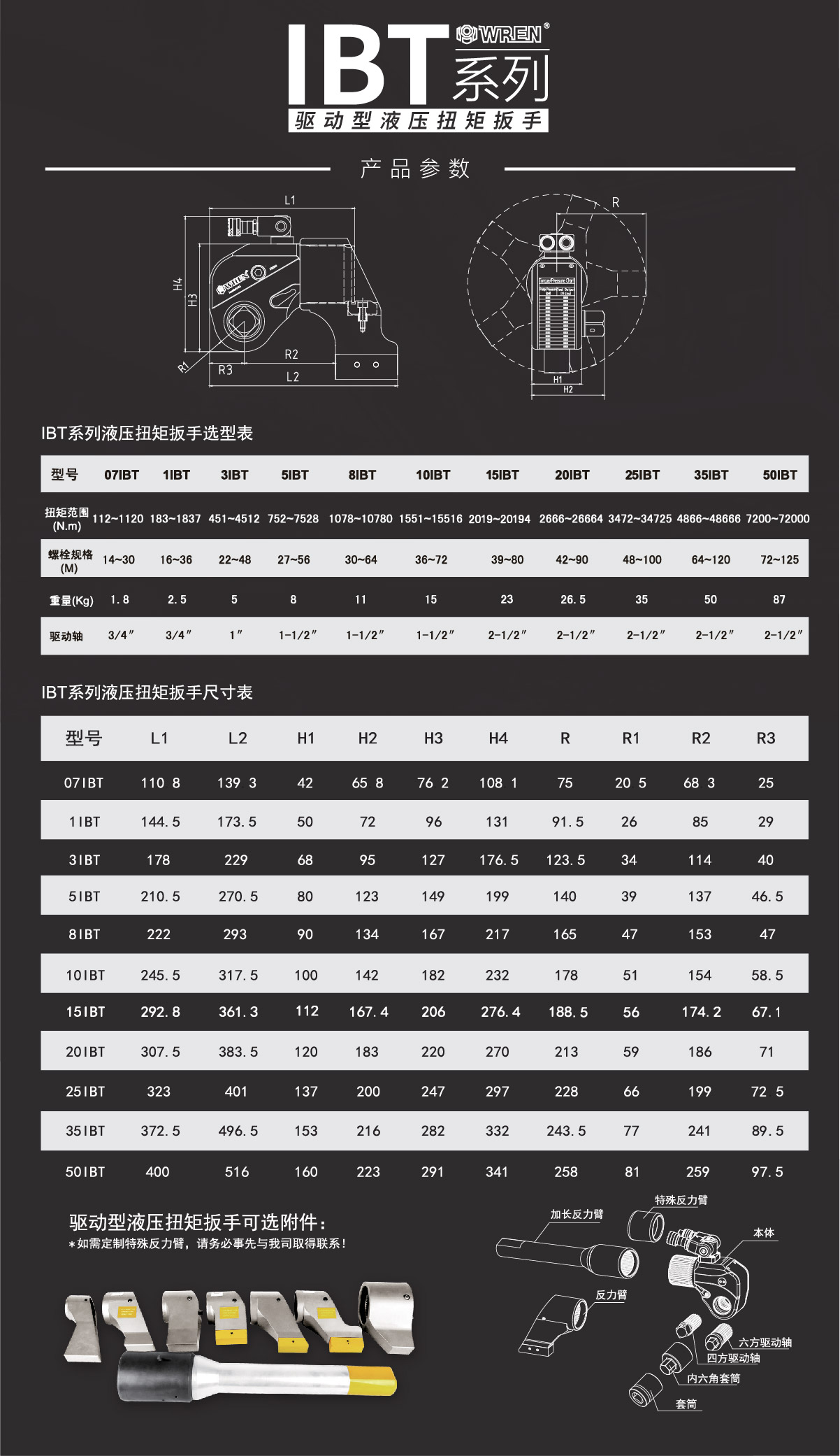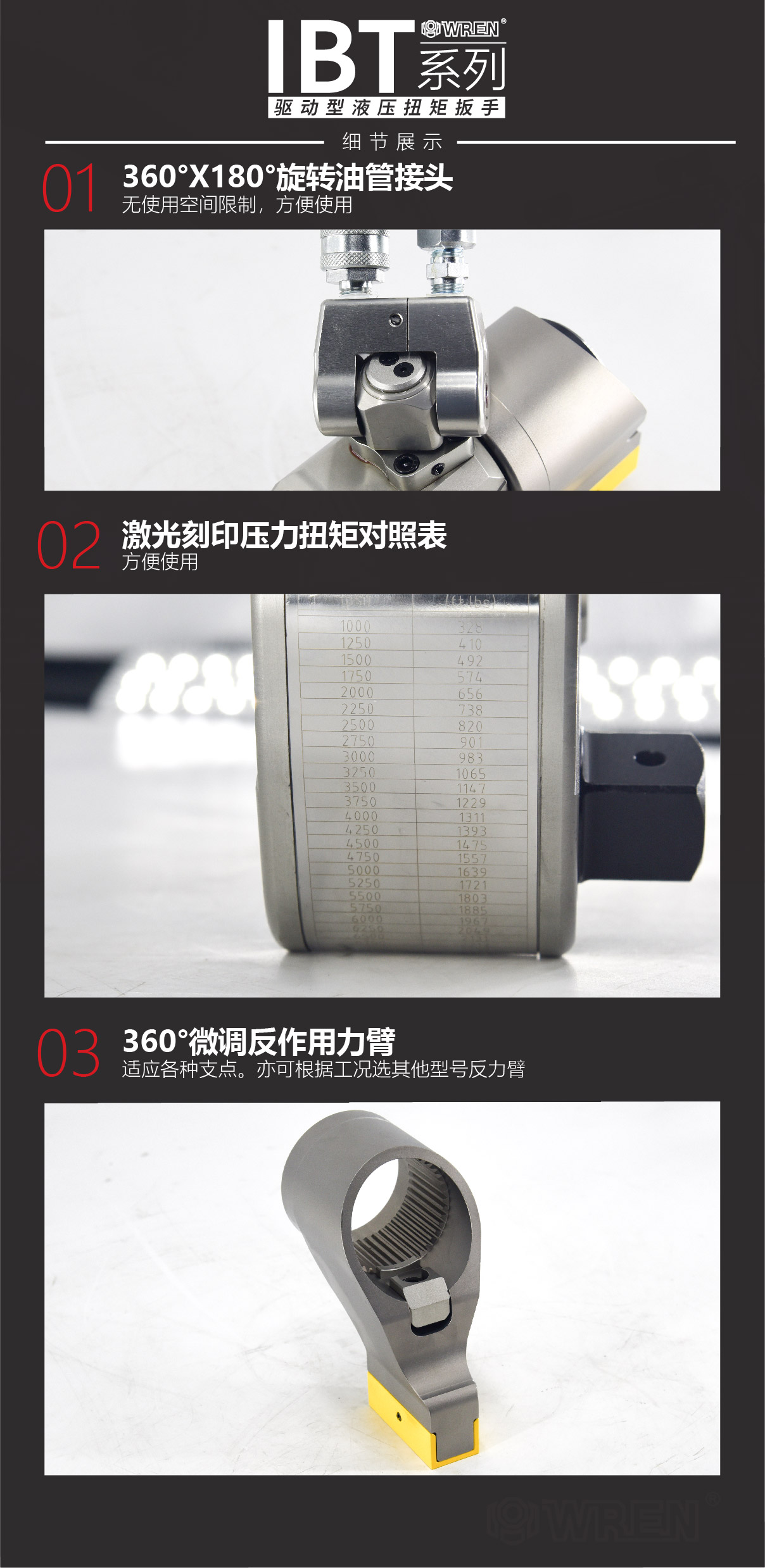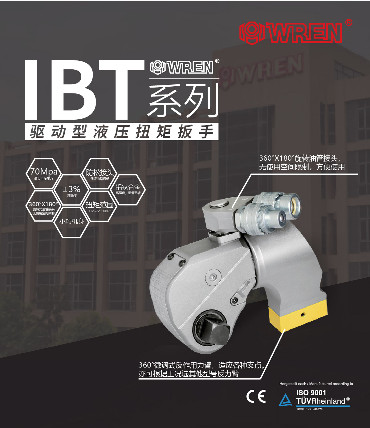 IBT系列是WREN公司主力投放國際市場的一款專業(yè)級別的液壓扭矩扳手。其鋁鈦合金的航空材料的液壓扭矩扳手重量輕,強度高,值得注意的是IBT系列液壓扭矩扳手擁有從112N.m~72000N.m共10個標(biāo)準(zhǔn)型號,其適用規(guī)格之多,螺栓覆蓋率之廣,體現(xiàn)出WREN公司從事國際螺栓服務(wù)的扎實基礎(chǔ)與專業(yè)精神。WREN品牌提供全球售后服務(wù),擁有完整的配套供應(yīng)能力,通過德國萊茵TUV認(rèn)證及歐盟CE認(rèn)證