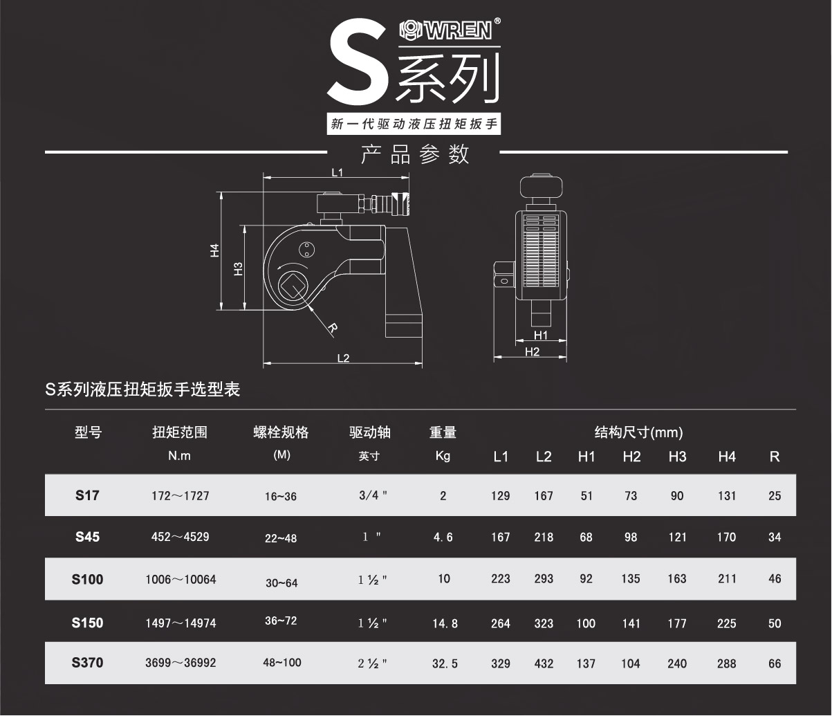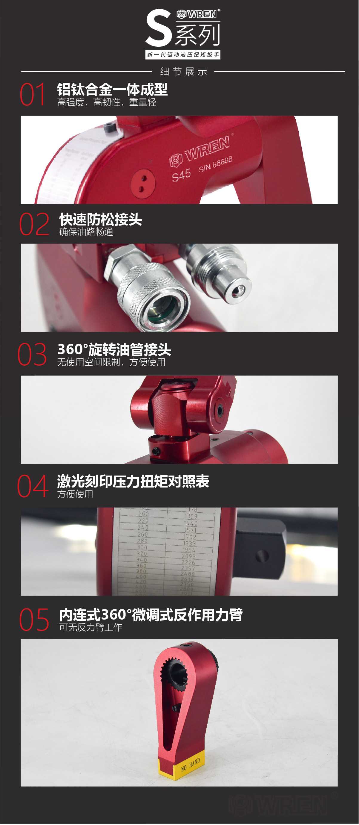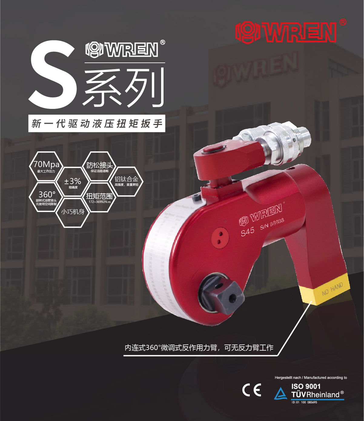 S系列驅(qū)動型液壓扭矩扳手是融合了高科技的新一代產(chǎn)品。鋁鈦合金的航空材料液壓扳手重量輕,強度高,小巧的機身可以幫您完成重要的任務(wù)。S系列驅(qū)動型液壓扭矩扳手擁有從172N.m-36992N.m共5個標準型號,可以出色的完成螺栓的預緊以及拆松。WREN品牌提供全球售后服務(wù),擁有完全的配套供應能力,通過德國萊茵TUV認證以及歐盟CE認證。
